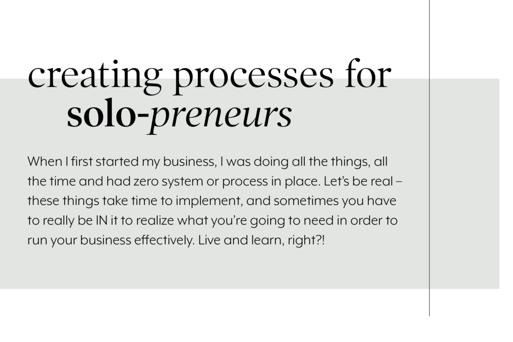 When I first started my business, I was doing all the things, all the time and had zero system or process in place. Let’s be real – these things take time to implement, and sometimes you have to really be IN it to realize what you’re going to need in order to run your business effectively. Live and learn, right?!