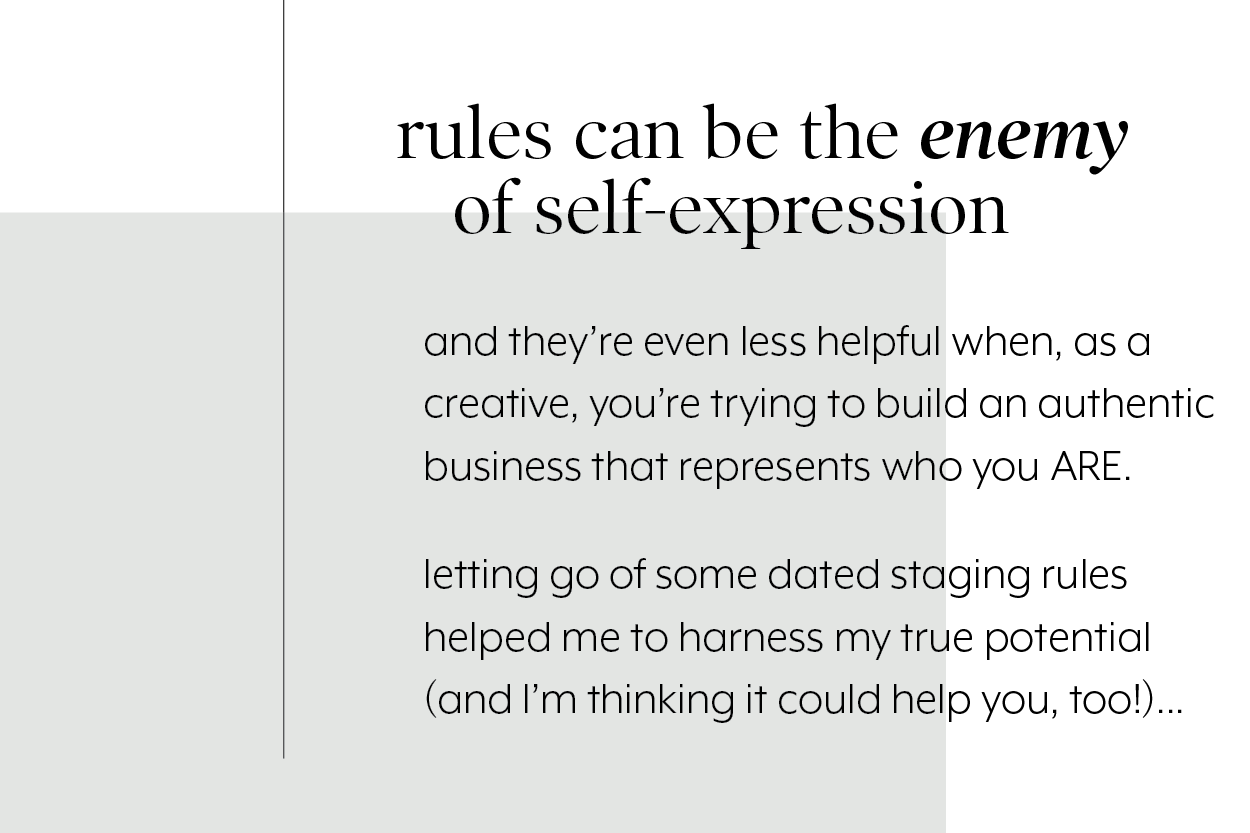 Rules can be the enemy of self-expression, and as many of you know, being a self-employed creative empowers us to live outside the box. When I first started my staging career, I was wary – I had to remind myself that I was going to do this MY WAY, which meant releasing any “rules,” about